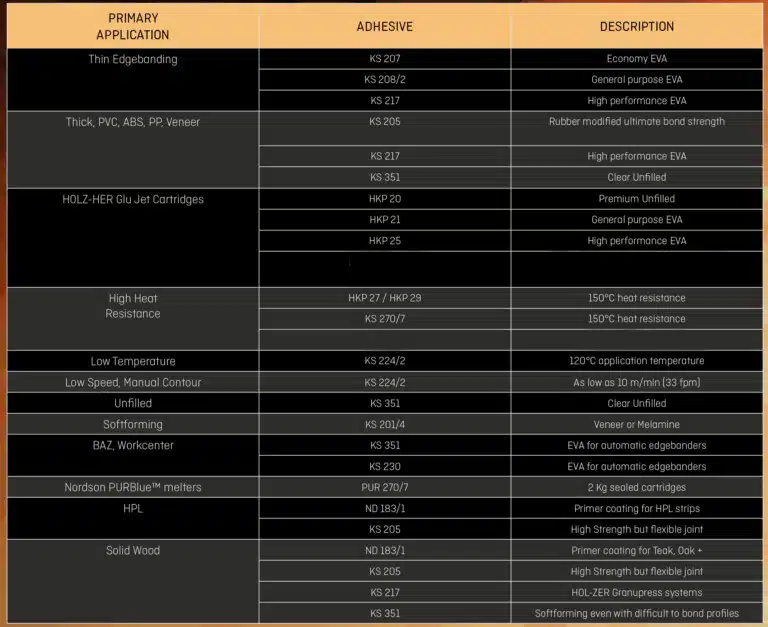 A fast melting, high viscosity, natural (beige) colored hot melt adhesive cartridge designed for a wide range of uses. Recommended applications are PVC, ABS, Polyester, Melamine, Veneer, and Solid Wood.