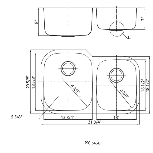 [ExtendedDescription] => Undermount Dbl Bowl 31.75"x20.625"OD x 9"|7"D 16 Gauge Type 304 18/10 CrNi Large Bowl Left #U360